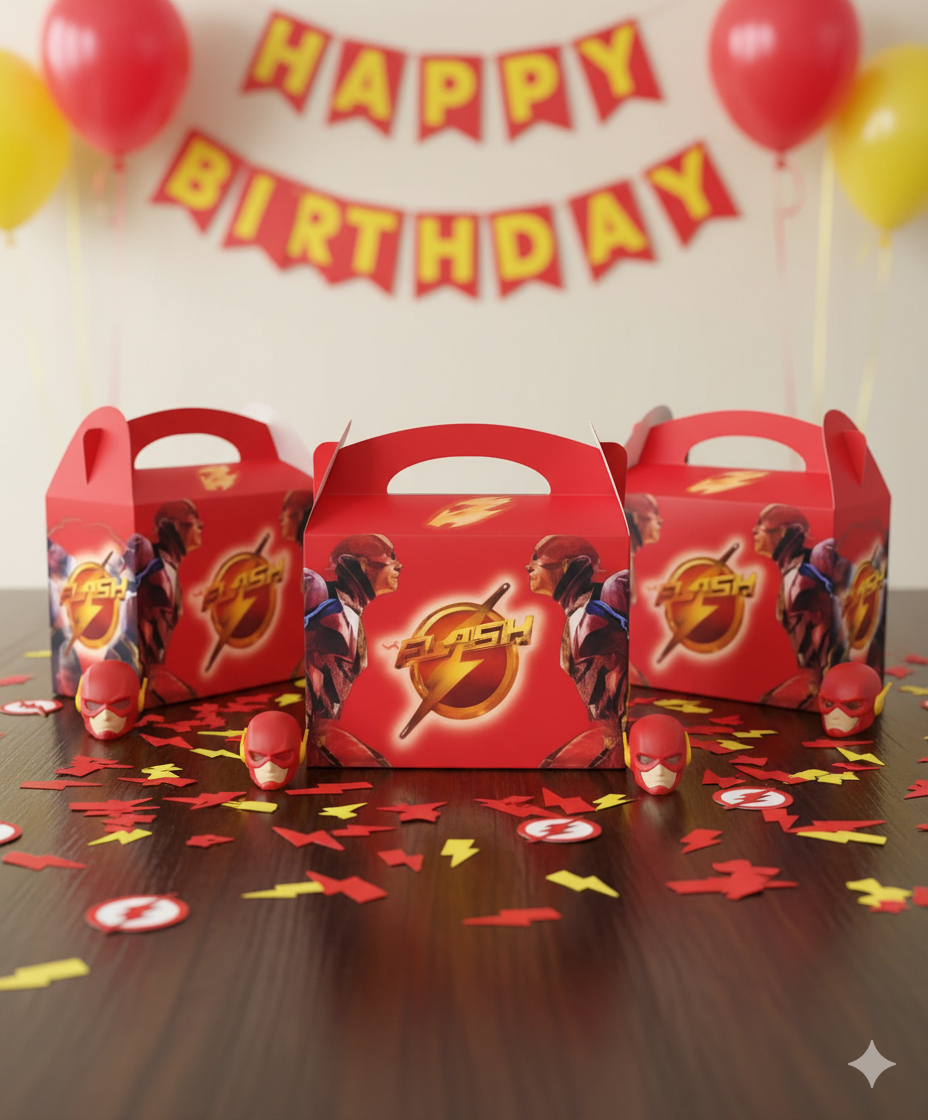 -6 Cajas sorpresa alto 15cm, largo 15.5cm y profundo 7.5cm temáticas de Flash perfecto para cumpleaños u ocasiones especiales